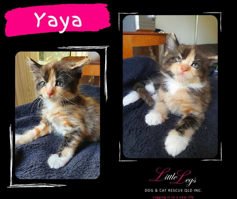 Well hello there, pleased to meet you. Let me introduce myself... as you read above my name is Yaya and mum says I look like a ""paint-by-numbers"" model with my colourful and fluffy coat! Did I tell you how high I can jump to catch a feather toy? Man! I make the craziest jumps and summersaults, I could join the circus mum says, I can catch a fly mid air!! I am a sweet and energetic young girl. I love to play with my 5 brothers and sisters and the other cats in the house and I'm full of life and love. I love playing with and cuddling up to another kitten buddy or a cat friendly adult cat so please don't let me be all by myself in my new home, I would feel terribly lonely, unless you are home all day. If you don't already have a kitty and have room in your heart & home for myself and a sibling maybe? We are all good kids, well mannered and gentle natured, just an idea I'd love come & live with you and your cat/kitten and be a real member of your family? Ohhh that will be the best... a forever home with a new family or single human that I can love & that loves me... That's what fostered babies' dreams are made of my foster mummy says! I'm looking forward to our meet & greet very soon! Yours forever (hint, hint), Your little girl Yaya
