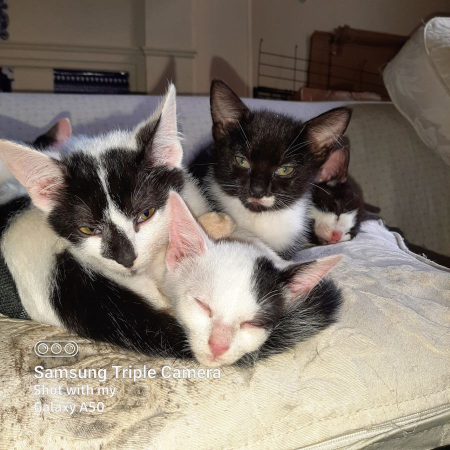 we know they are related as the kittens all share similar genetic identifiers. A mix of black and white in the 3 litters and a uniques moustache on the predominantly tuxedo cats.