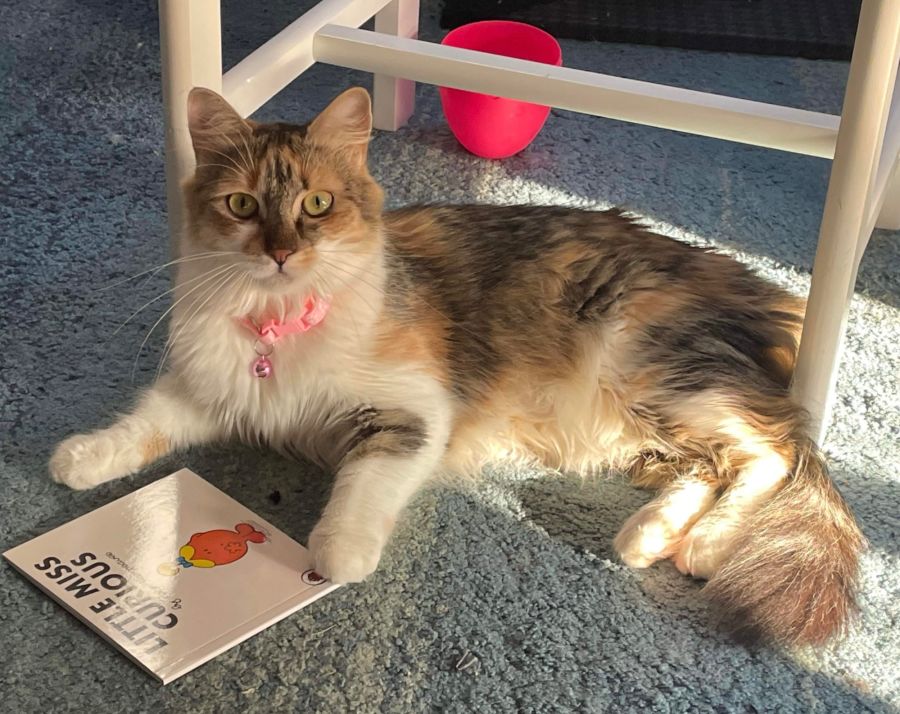 Hazel is a small cat, with a bushy tail and a tiny meow. She loves to hang out on the sofa or snuggle up with you.