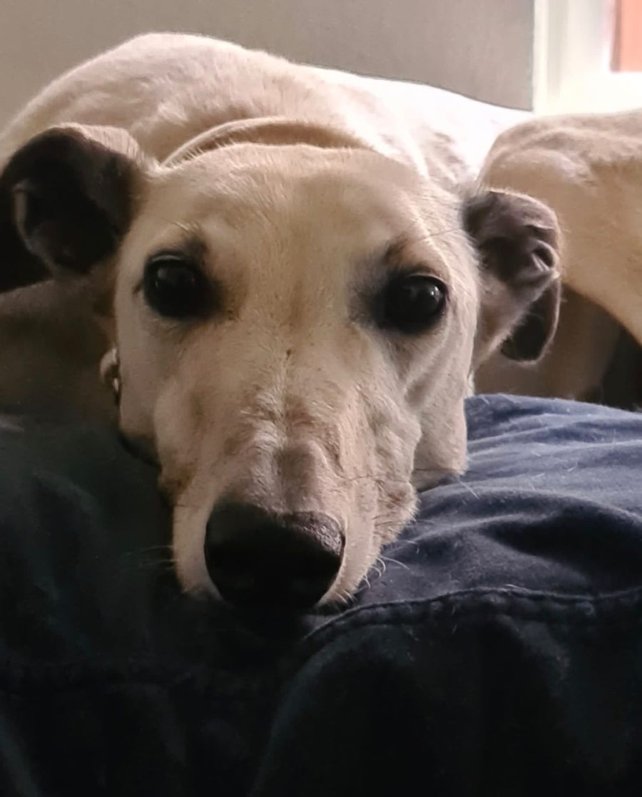 Sandy is in foster care with a younger male grey with who she gets along well, but she would also be fine as a solo dog. Previously used as a breeding dog, Sandy is loving life and the freedom to get all the attention for herself.