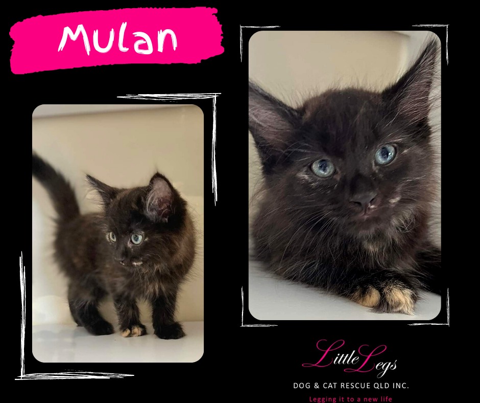 Hello there, I’m Mulan! I am the prettiest dark tortoiseshell girl you ever did see. My long fluffy coat makes me the perfect companion to snuggle with and my purr is enough to soothe the soul. I may have grown up with two brothers, but true to my namesake, I can hold my own perfectly fine and do not allow myself to be left behind. When I first began my journey into my foster home, I was a little bit wary and afraid, but after 24 hours of hiding under the couch, I realised all the fun I was missing out on and now I rough house with the best of them. I love a scratch around the head and ears and will reward you with that soulful purr of mine as I happily flop into your arms. My foster mum thinks that whoever has the pleasure of giving me my forever home will be very very lucky as I truly am just a little darling.