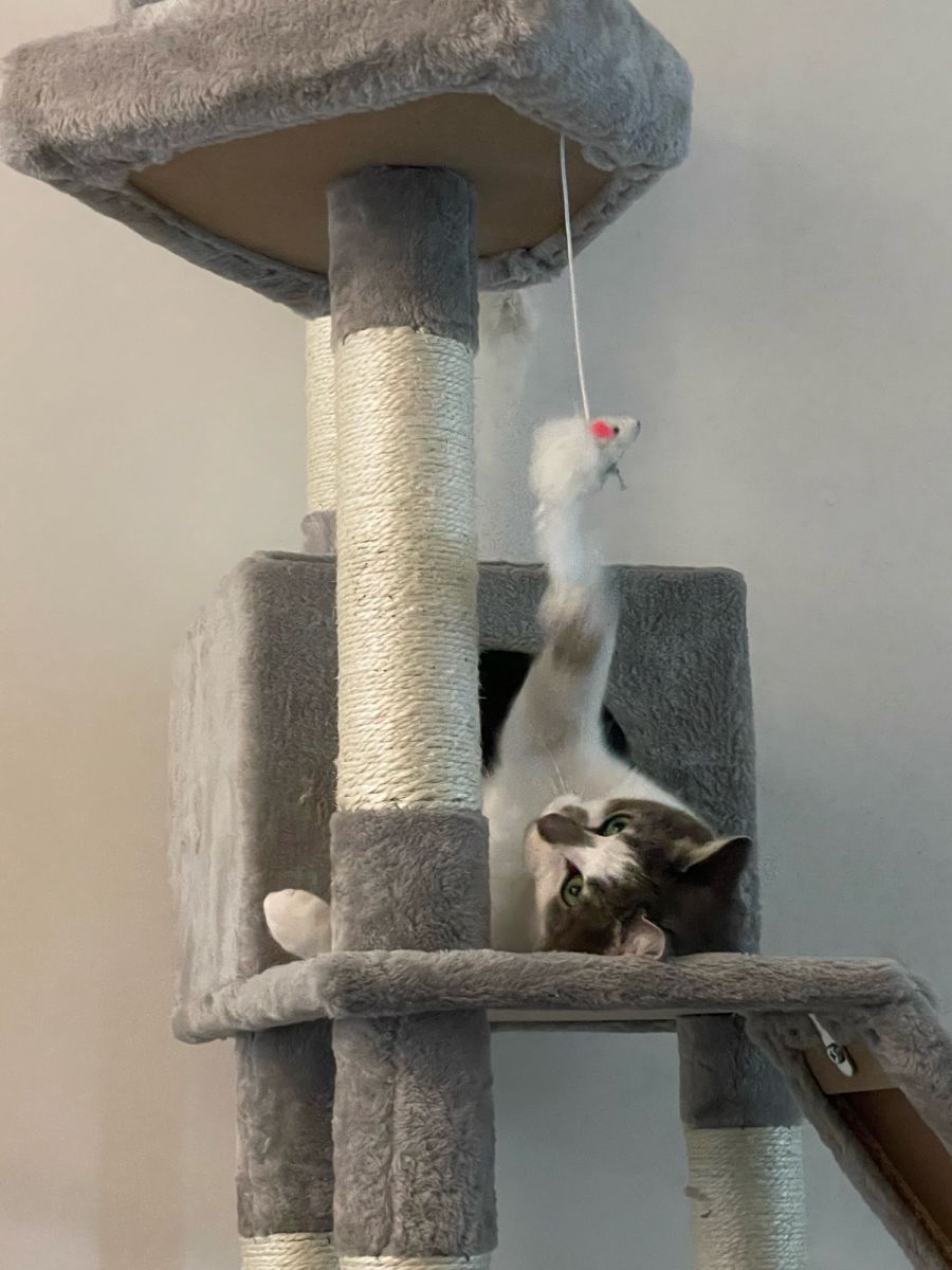 On a typical day, I wake up together with you, ready for cuddles. Then I'll snack throughout the day when I feel like it. I like to explore, sniff and climb. The best spot for people-watching is on the balcony. Evening time is zoomie time! After my playtime, I'll have another cuddle on the couch. On extra special days, my human will take me for a walk around the block on a lead - it's the best!