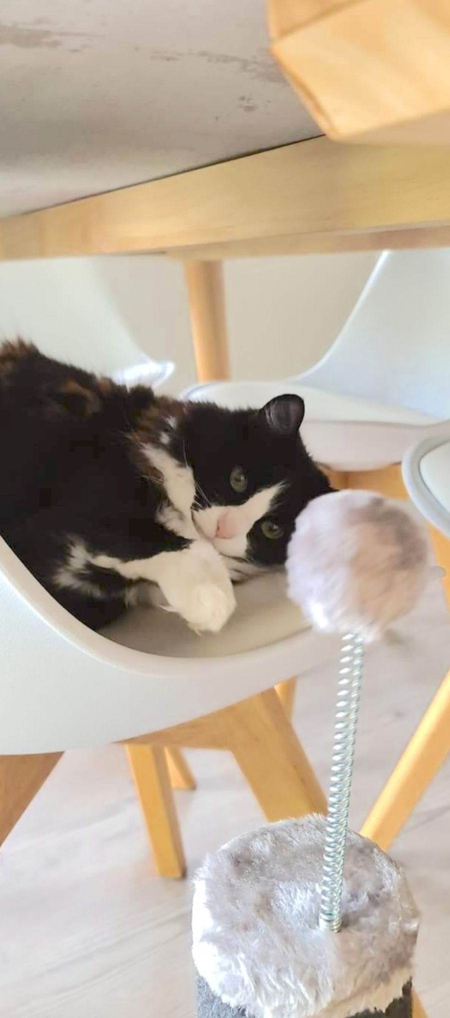 Dinah likes to spend her time hanging out wherever her humans are. Her favourite spot is on the arm of the couch. She loves a pat (sitting on her human's lap is a bit too much, though). She's a curious lady and wants to know about everything around the house. Dinah also likes to play. Her favourite thing to play with is a string.