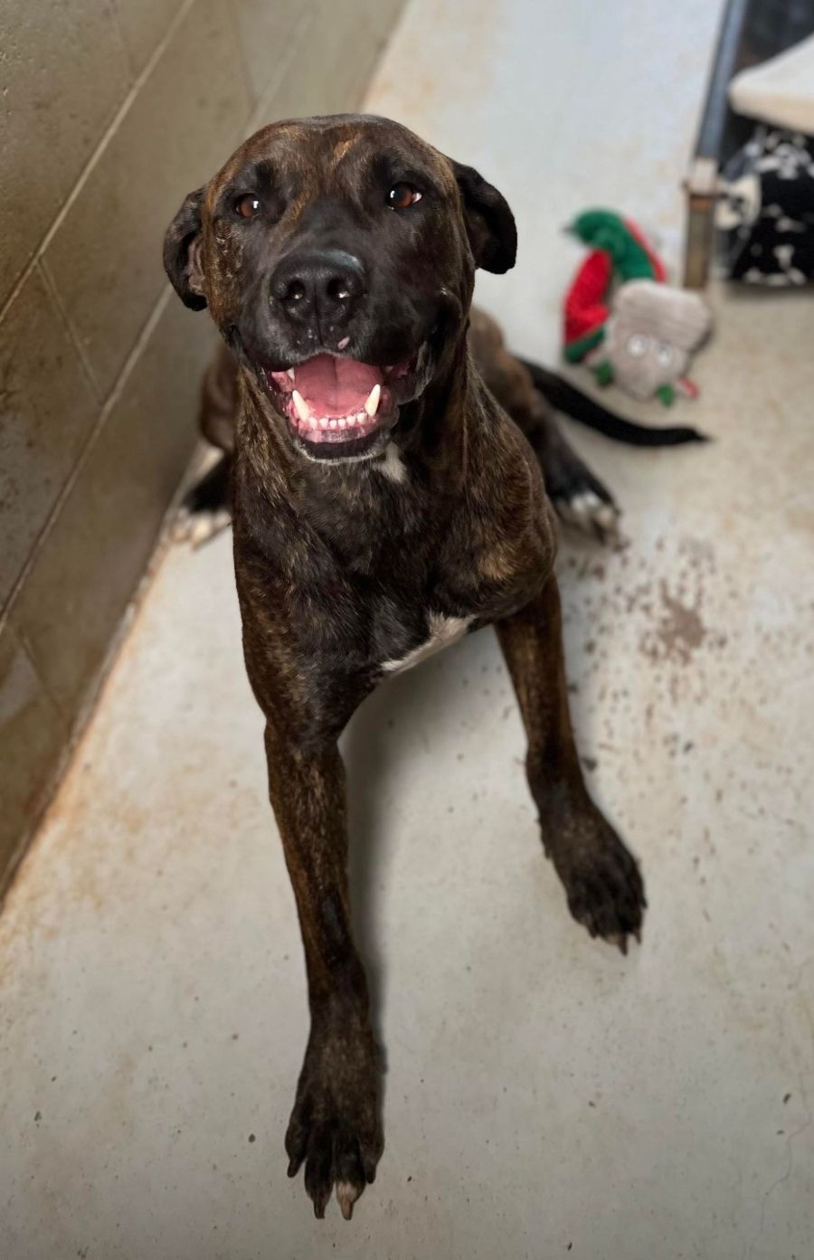 IMP 563 STORMIE. Storm or Stormie is a female brindle staffy mastiff mix, medium sized, 2 years old. She is a very sweet affectionate loving girl! She is also quite submissive and dog social. She is good on lead and clean in the kennel. She loves children, loves to run and is house trained. She has been an easygoing girl here at the Shelter. She just needs a home with consistency and love. Her $400 adoption fee includes microchipping, registration, vaccination, desexing, worming and flea treatment. Please call 6583 3488 or visit during opening hours. Thankyou