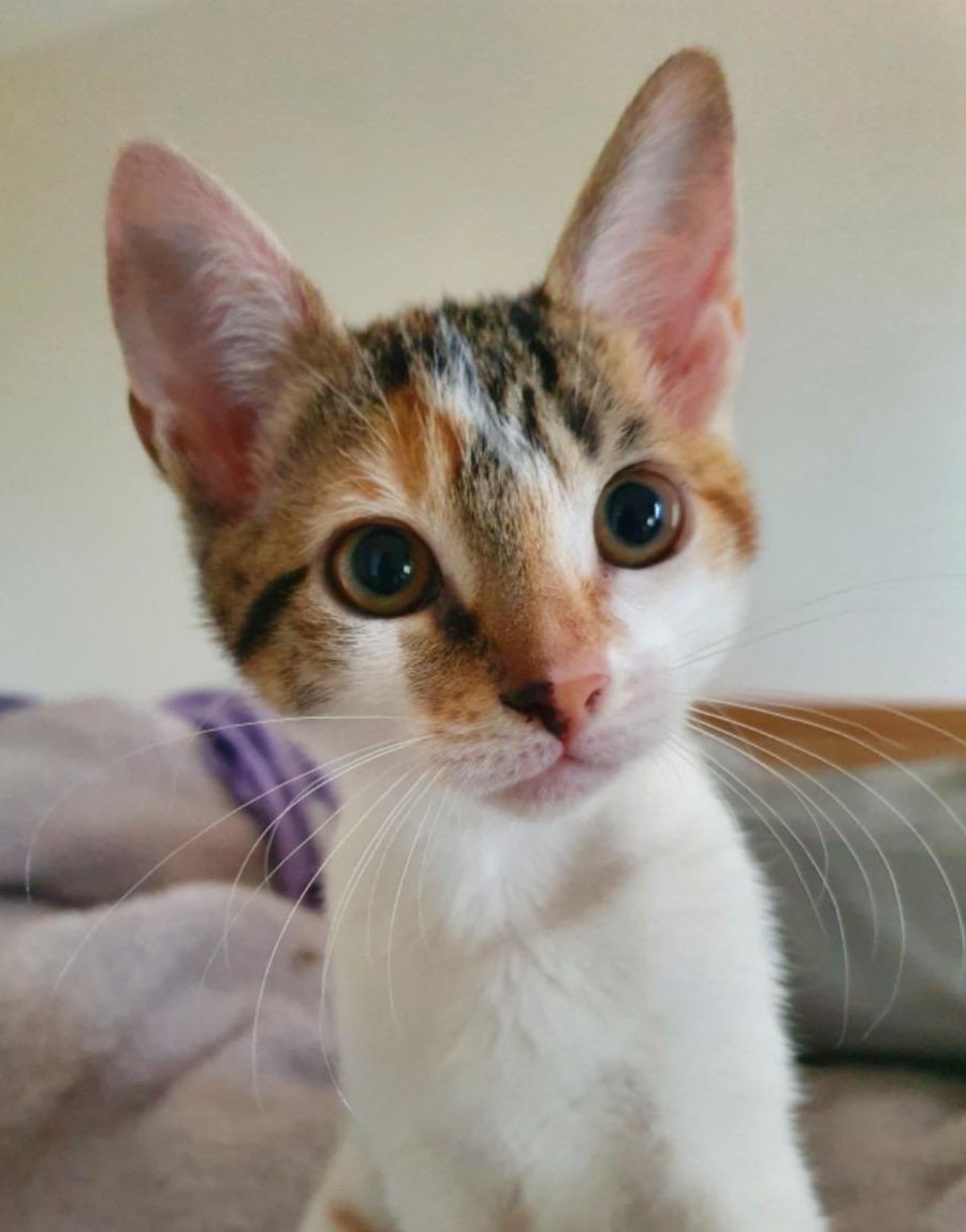 Bambi is a cute calico kitten who is curious and active. She sometimes does zoomies when she gets excited, running round and around & backwards and forwards very fast! Bambi loves to play with her brothers & sisters and her favourite toy is the pink spring.