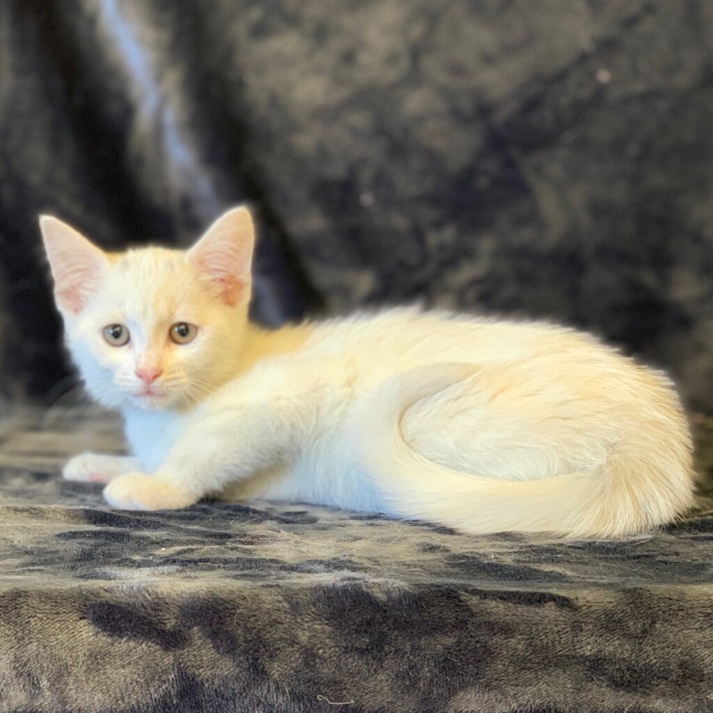 Cleocatra is one who will stand out from the crowd with her stunning pale coat and unique splash of black that can just been seen. Cleocatra is an adventurous young lady who enjoys all the small pleasures in life especially play time and feed time.