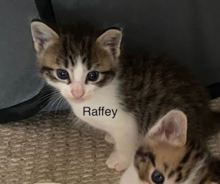 Raffey is like her brother Rudy…. Very laid back and relaxed. She is a lovely little girl who is happy to sit and watch all the craziness of her brothers and sisters (also up for adoption) wrestling or playing chasey. She especially loves to play on the cat tree or if there is a toy on a stick… watch out, she is in there playing hard to get that toy.
