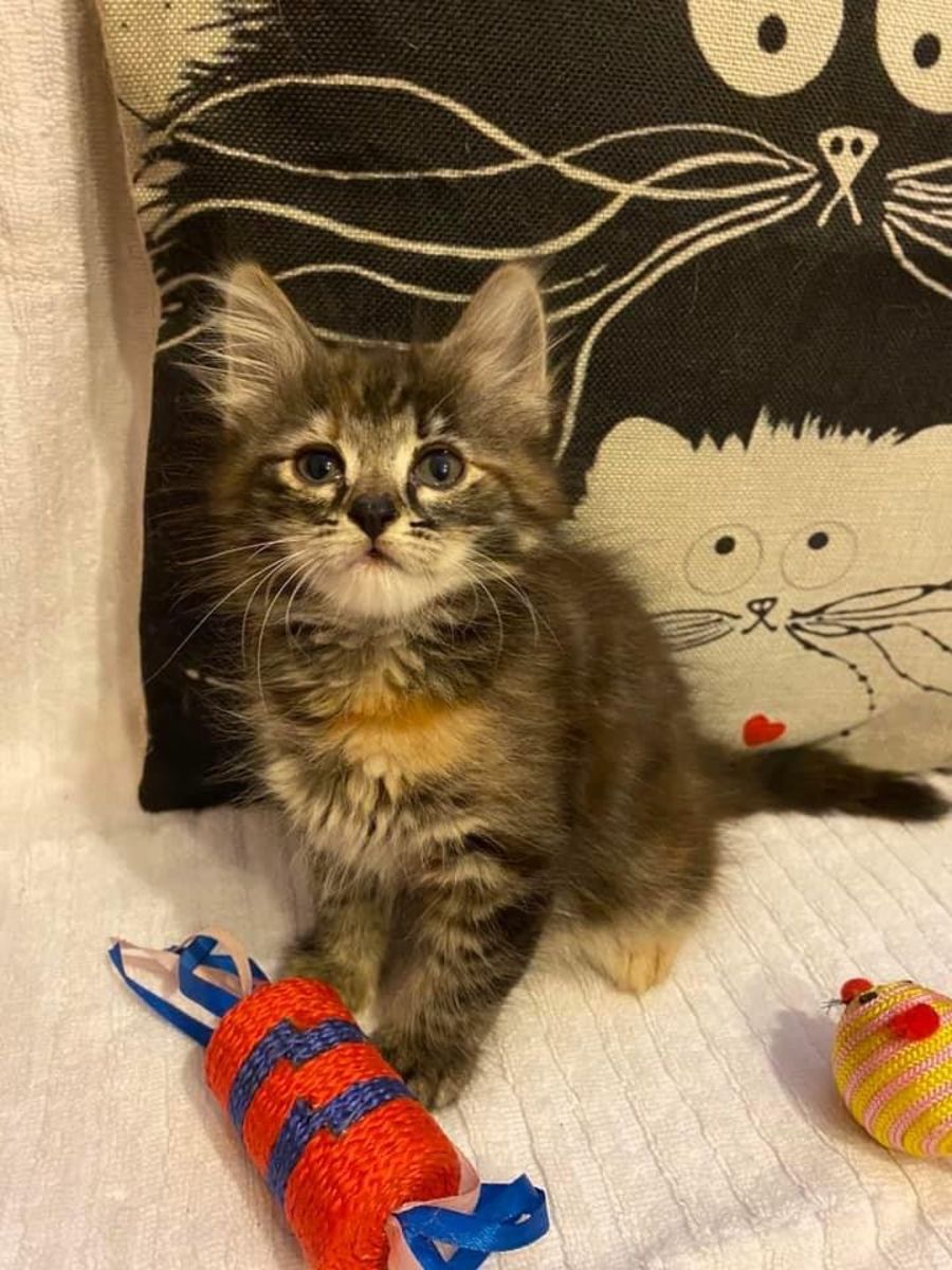 This gorgeous little 7 week old puff of torbie fluff is all about play. She will turn anything into a toy, lids, pens etc, but balls are her absolute favourite.