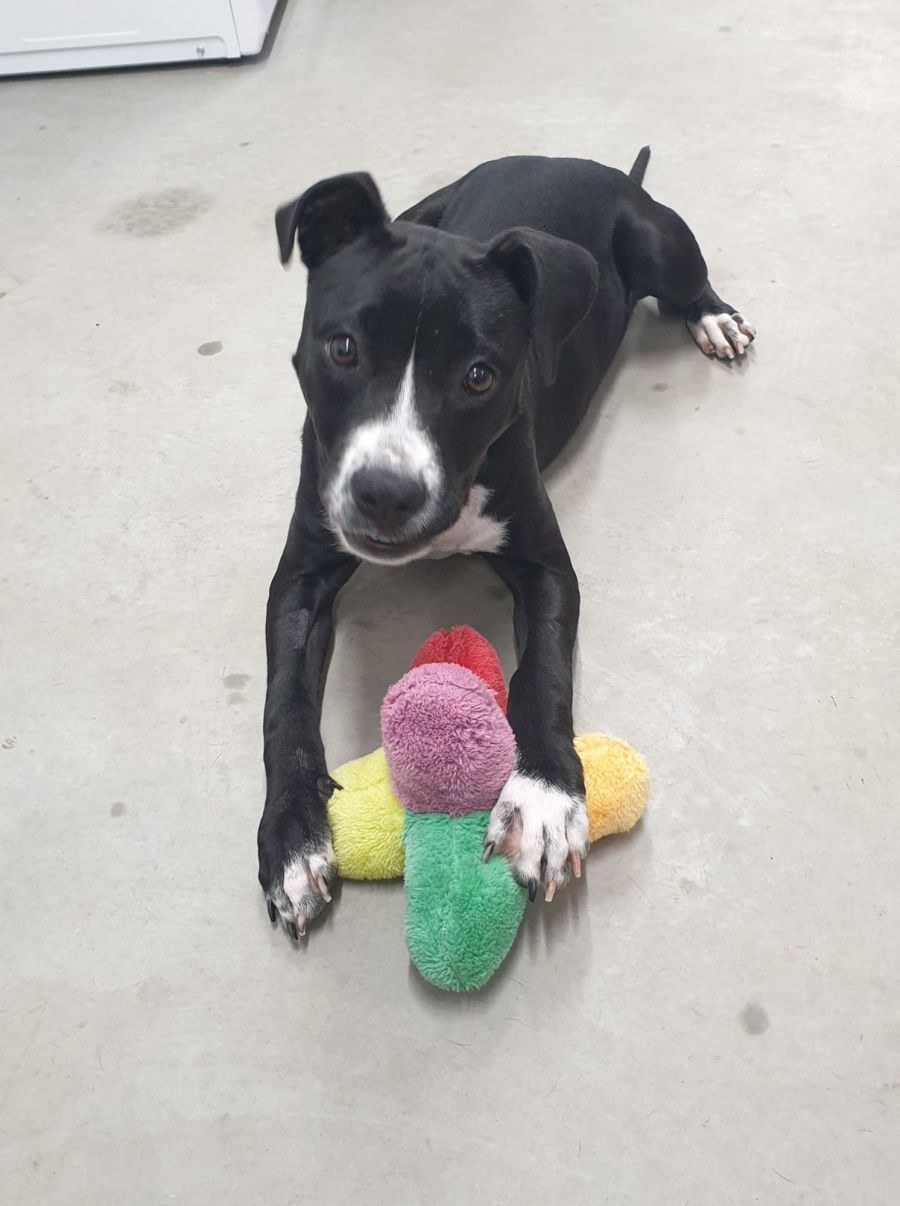 Whilst Storm loves being around people, she has shown no signs of separation anxiety during her stay with us. Give her a couple of toys when you need to go out and she will keep herself occupied. She particularly loves soft toys, but also very much enjoys squeaky toys and tennis balls, and she will bring them back to you to throw again and again.