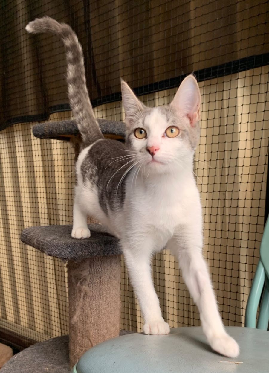 Taylor is waiting for you to come and play. This 5 month grey & white tabby boy just loves his toys, chasing balls and trying to catch the mouse on the string. Once the playing is done, he will happily snuggle up for cuddles (he has a lovely little purr) and an afternoon nap, before playtime begins again. While in care, he has been surrounded by children, other foster cats and the resident dog, and would make a perfect addition to any family. He is litter trained and not a fussy eater. He comes desexed, microchipped (#941003000433209), vaccinated, wormed and with flea prevention. Located at Gorokan for Claws n Paws Rescue 💙