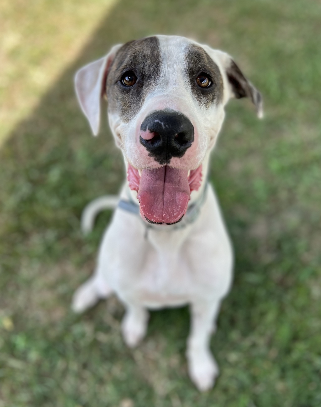 I have a beautiful shiny coat with one colorful ear and a few patches. I have this sweet smile that my human friends adore and I love to bounce around when I am happy.