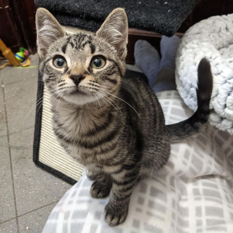 This little gentleman is super friendly, and super fearless. He loves being picked up, and will lie happily purring on your lap while you binge-watch season 2 of Bridgerton. An affectionate and outgoing kitten who would be suitable for most homes!