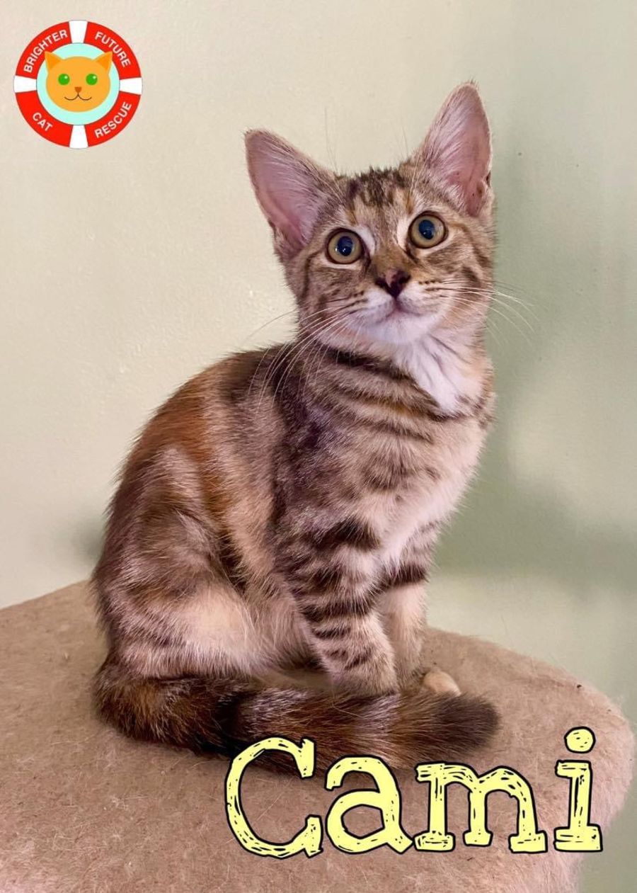 Cami is around 11 weeks old, and is very confident with other cats and small dogs, and would make a great kids cat. This pretty girl has a gorgeous coat with rich swirls throughout, and a tail that quivers when she’s happy.