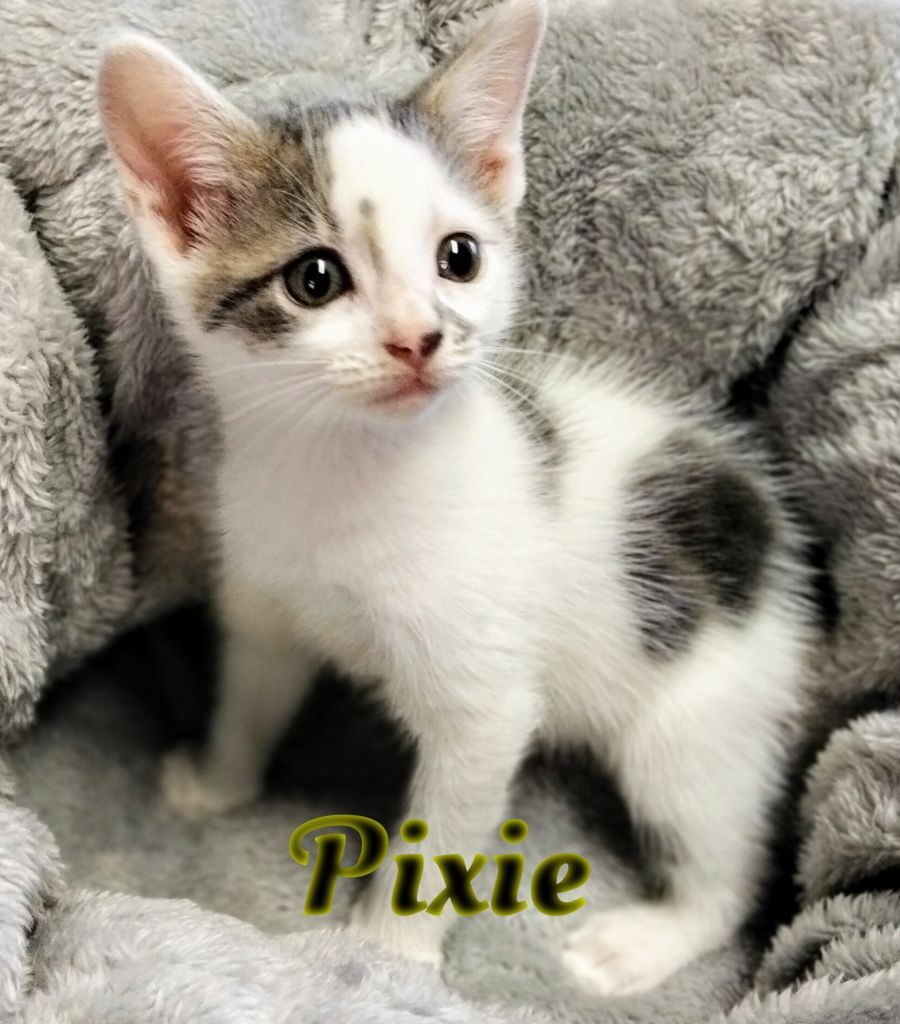This is little Pixie. Born on February 16th, Pixie is one of 6 kittens. She is the only mainly white kitten