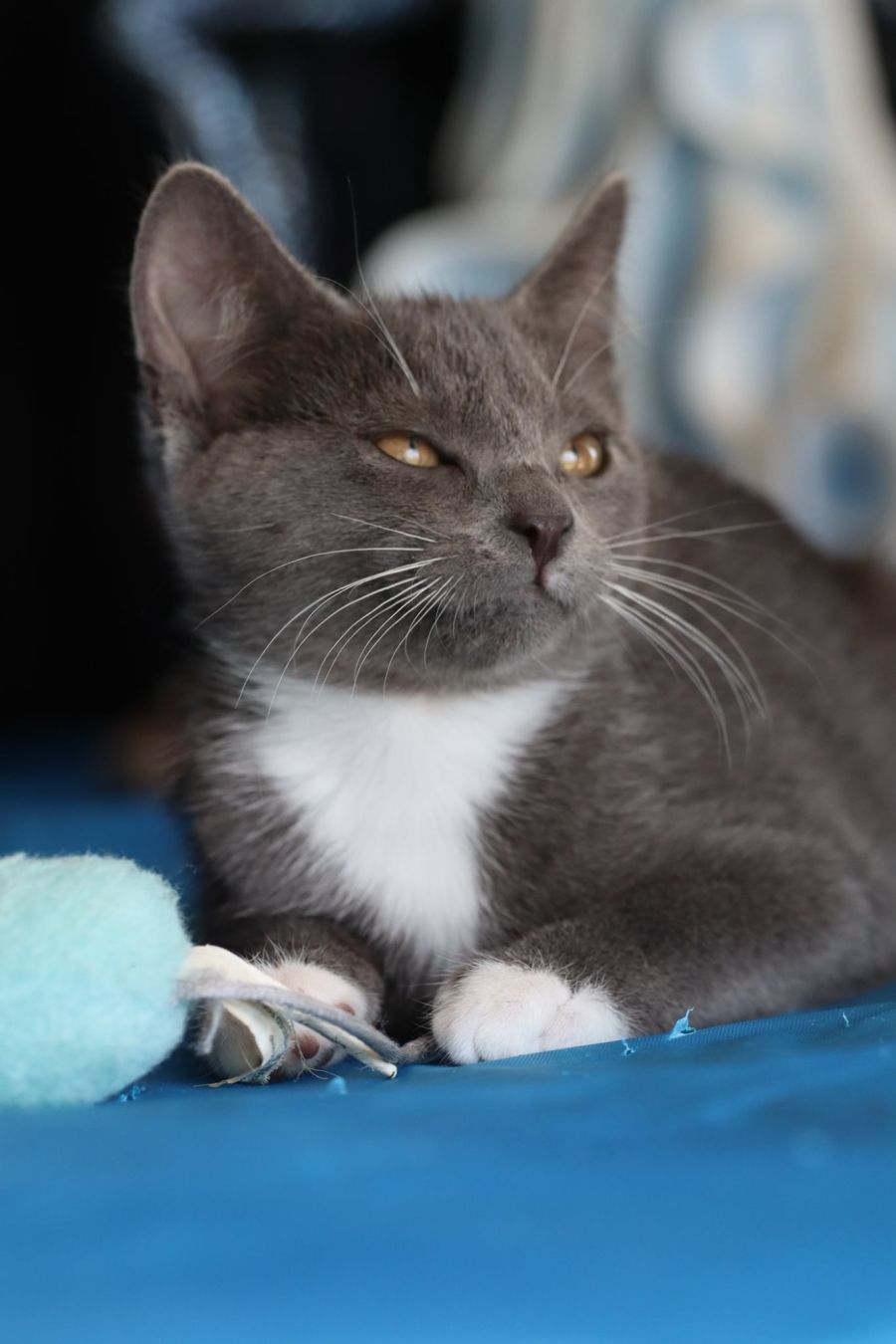 Storm is a beautiful playful sweetheart ,always has a toy playing and is curious about anything new ,plays nicely with the other kitties loves a cuddle and yes a purr machine. Storm gets along with our dog and other residents is litter trained Storm is very independent and is happy to go off and play solo without the other kitties