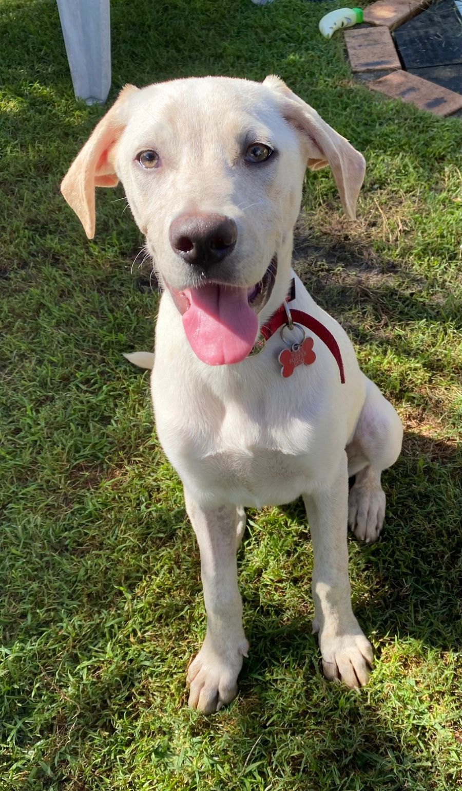 Lily is one of a litter of 10 puppies surrendered to NRAS. Half look Bull Arab X & half look Cattle Dog X. She looks to be a Cattle Dog X with maybe a Lab (?) with short hair. She is a smart puppy who picked up the sit trick very quickly. She has not spent anytime inside at her foster home & happily sleeps outside in a crate. Highly motivated by food she is easy to teach new tricks. She is very fearful of a lead, really freaking out when it is put on her, so she will take time to get used to that. She is also nervous when being picked up. She is very snuggly with her humans & loves playing with her siblings. She is not tested with cats, but is very happy & comfortable with her large host dog. She loves to run around & play in the yard, but has commenced a bit of digging. She does still jump initially, but that will improve with time. She is pretty self sufficient when left at home playing with her siblings, with toys, rocks, sticks etc. She will be a great dog with a good temperament, she just needs to get more confident on the lead.