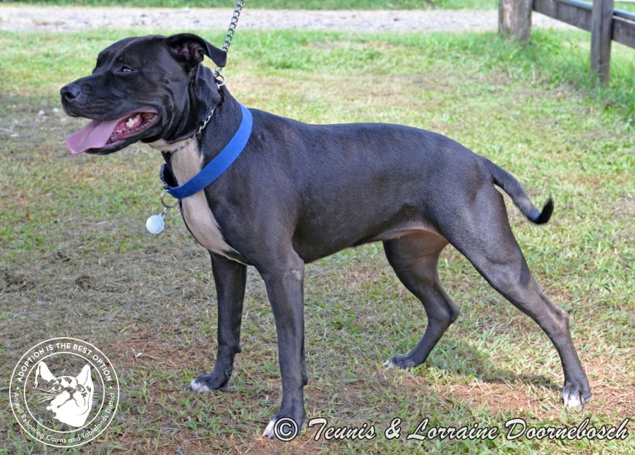 Jordan is a typical staffie who is a “fun and people” seeker. For this reason she will require either acreage where she can run or a good sized yard with 1.8mtr to 2mtr fencing with no footholds and not be left home alone for long periods. Once Jordan has bonded with her new owners they will have a friend for life. She enjoys being with other dogs but is not recommended for cats. She is a happy girl who loves her walks and is great on the lead. She has lovely manners and even sits for her meals which is very sweet for a Staffie. Jordan is a water dog who loves playing under the hose and paddling about in her paddle pool.