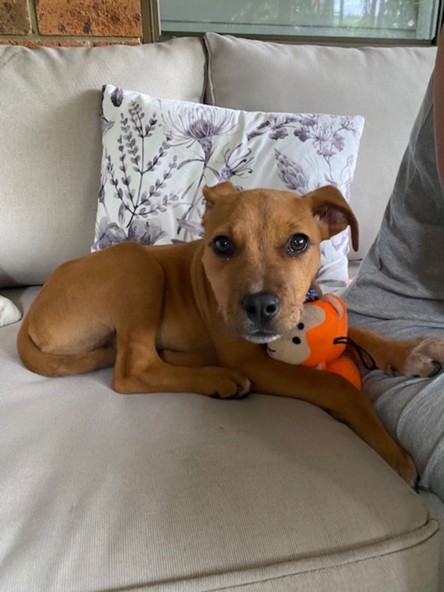 My foster mum is home most of the day, and I am OK if she goes out for a while as I just lay in the sun and chew my bone or toys, but boy, when she gets home I jump up and down and do circles! I am sooo excited! I would love my people to be home a fair bit while I am still young and getting used to the world. I’m pretty chilled out for a puppy though.