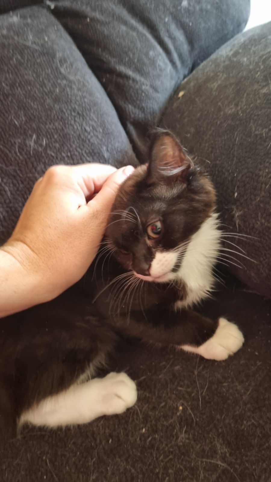 Calamari was born in foster care, their mumma Lobster was a family cat who ended up pregnant and was surrended. Because of this the kittens have had the best of both worlds, a very healthy mumma who was a very good mum to them and all the good parts of human house with all the extra food, love and healthcare.
