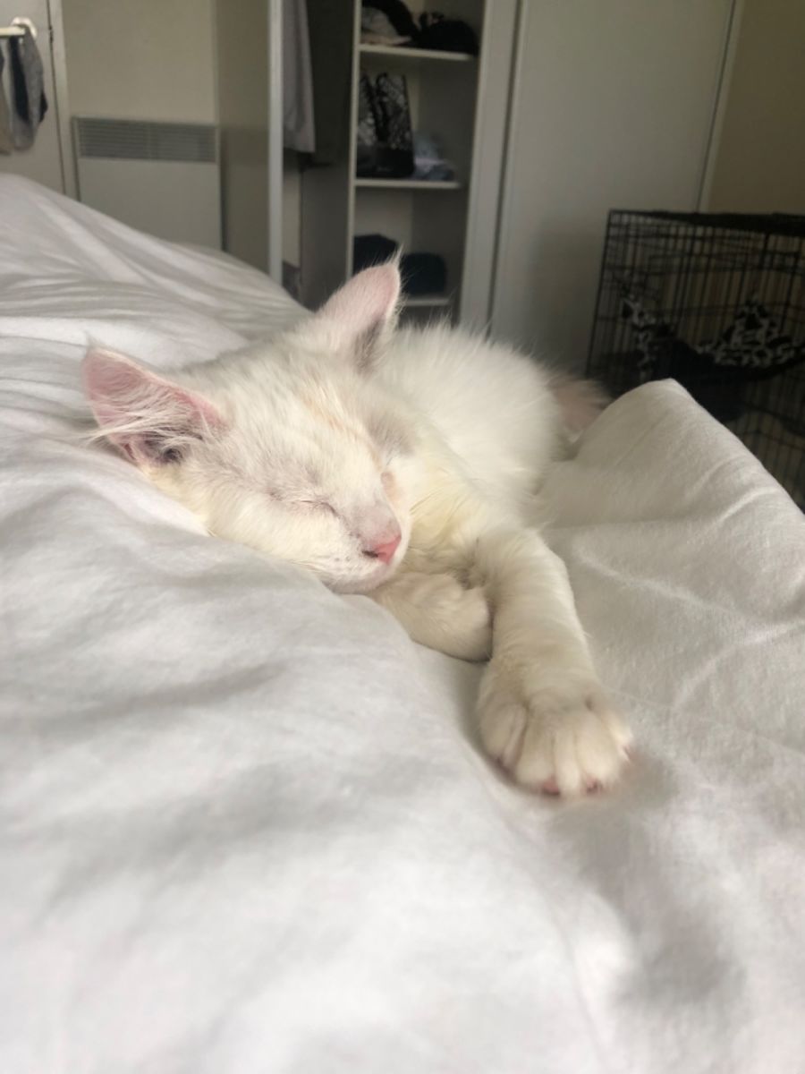 Moose had ringworm as a young kitten (a fungal skin infection). He was treated with oral medication and medicated baths and has now been cleared :)