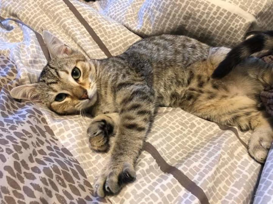He was a little shy at first, but has now settled into bed cat life. He quickly purrs and cuddles into his foster carers at night and rolls around for pats.