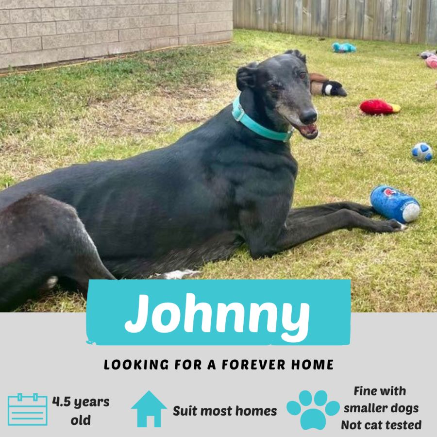 Johnny is a fast learner who has already mastered the stairs, waits politely for his dinner and walks well on the lead. He has a beautiful nature and gives everyone he meets a big cuddle and the greyhound lean.
