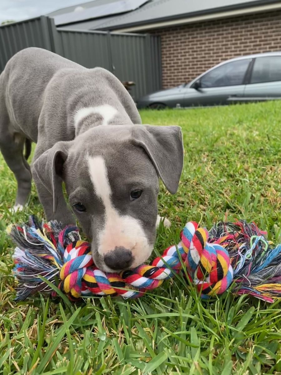 Meet Frankie, a gorgeous 9 week old American staffy x puppy. Frankie is a big puppy with a beautiful gentle nature. She is a happy, healthy girl who is growing and learning very quickly. She is very playful and loves a good wrestle with her brother and sister as well as her much bigger foster brothers.