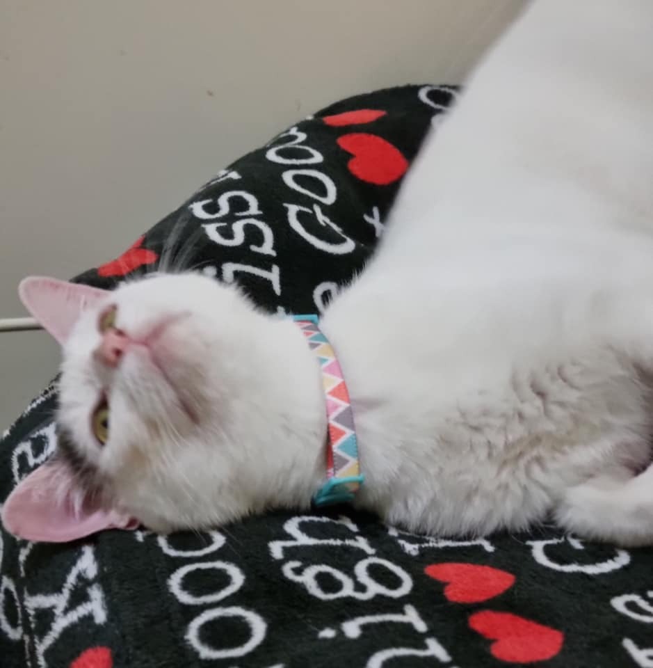 Adoption fee includes vet check, F3 vaccination, flea and worm treatment, microchip (including transfer of ownership), and sterilisation. Please note that as Charlotte has lots of white pigment (white ears, white nose) she will need to be predominantly indoors and be kept out of the sun during hot days to protect her from burning.