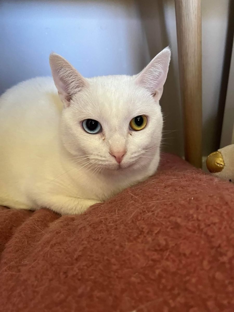 I’m a white kitty with something called Heterochromia. It’s a big fancy word to say I have 2 different coloured eyes. One is blue and the other is orange. Isn’t that cool! I’m a unique little kitteen!