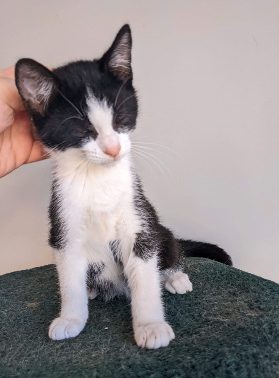This little scallywag is ready to find his forever home. He loves nothing more than hanging out with people and his siblings, and will play all day. He likes chasing around the laser pointer as well as hunting his mouse toys. He would suit a home with children or other cats to play with. He is a mega smoocher, and will climb onto your head to make sure you can hear him purring into your ear. He is a great little dude and will be a loving companion.