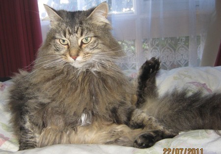 Bella has mellowed quite a lot since i last wrote about her although some of my other cats would disagree with this as she can still deal them a swift right hook if they are too intrusive. She has retained her particular dislike of petulia, my other long haired tabby beauty whom she seems to regard as her beauty rival, but she no longer has to occupy the exact centre of the bed and retains her good nature when shifted from a comfortable position on your lap. In the early days she was obviously facing more changes than she could handle and perhaps was fearful of an unkind response. While she laps up praise and affection, nowadays she seems happier and more confident, although she likes to be where she can see you. Bella is an intelligent and inquisitive cat and a loyal companion. She shows little desire to go outdoors, as she finds people activities more interesting. Her longer coat requires little extra maintenance. Bella is located at hampton park