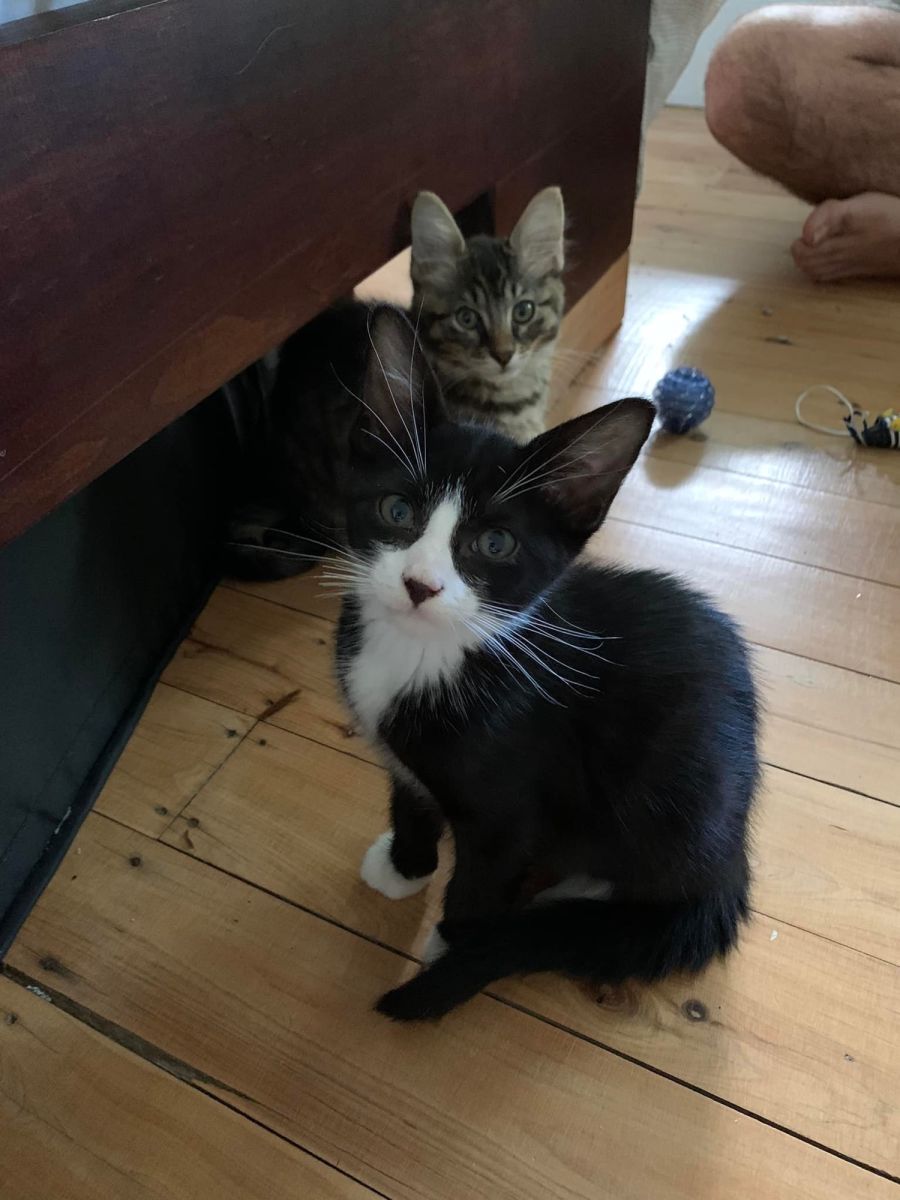 Timmy (smaller tuxie, half black nose) is affectionately named after Tiny Tim for being smallest in the litter but has caught up now! Timmy loves being picked up and carried by the resident 5yr old at the carers house and often gets wheeled around in a pram. This little guy is super loving and kind and would happily suit any family or single set up.