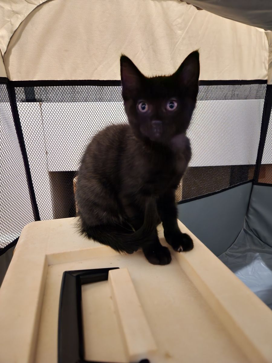 Skye is an absolutely stunning kitten. She is a black tabby with gorgeous stripes - like a little leopard! Skye is quieter than her sister Cassie, but still loves to explore, and loves zooming around the house. You can always find her snuggled up somewhere comfortable, and she has just started to find her purr. Skye adores her sister Cassie and is getting used to dogs as well.