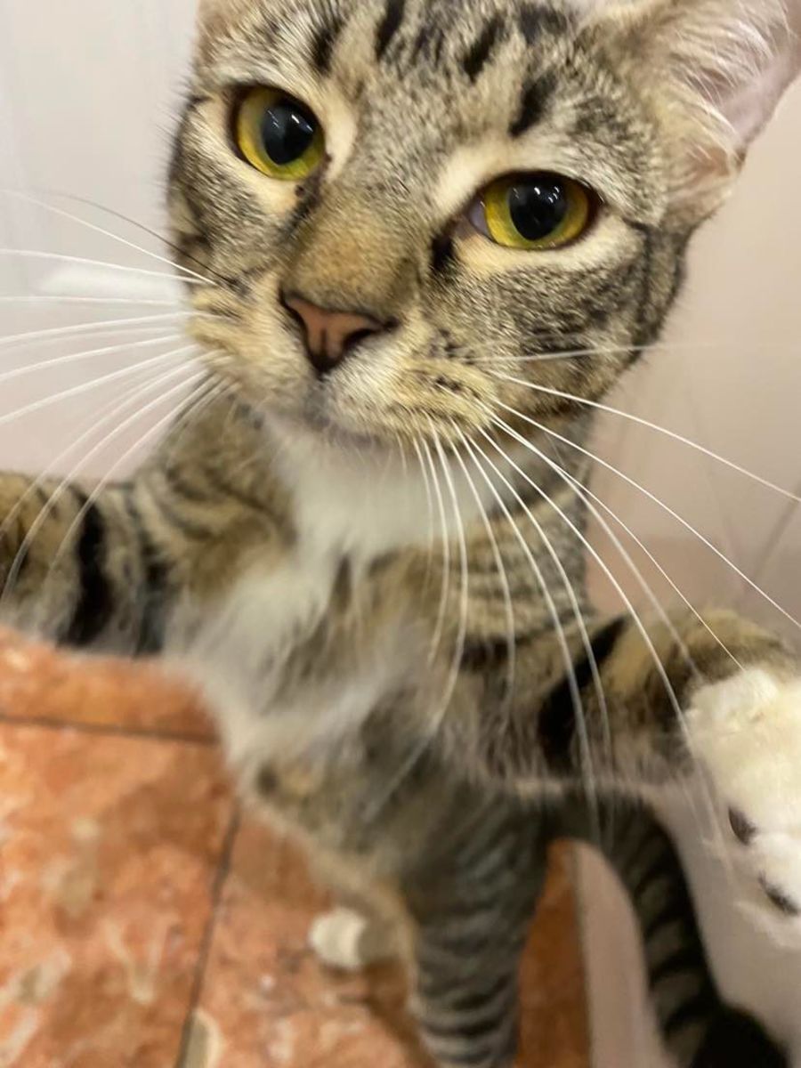 Freda is a beautiful sleek spotty tabby with big golden eyes and white socks. She is an extremely friendly cat and always greets you at the door when you walk in. She reaches up for a pat and will give you lovely kisses given the opportunity. She just can’t seem to get enough of these great humans who bring her food and give her a comfy place to sleep.