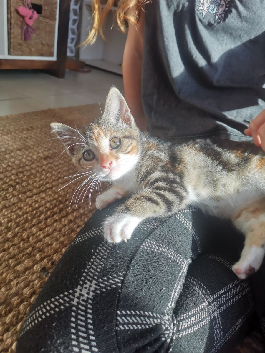 Nutmeg is a female kitten. She has is always up for a game, and loves to find bits and pieces to toss around the floor. She is lively but also will happily stay in your lap purring or find you sitting and try to curl up on your shoulder if she can fit. Nutmeg is currently fostered with her sister Paisley, they are looking for a forever home either together or can be separated.