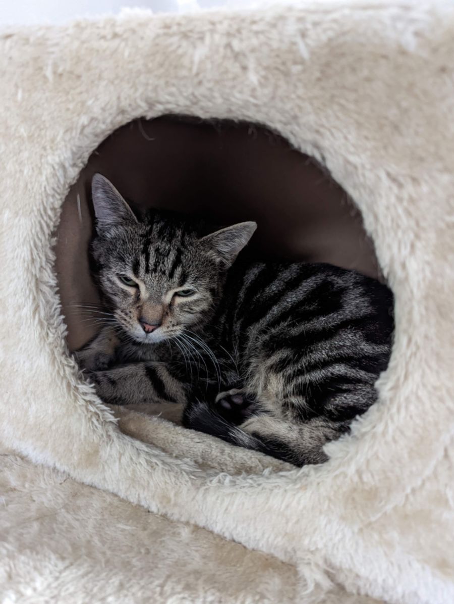 His favourite place to be is a safe hidey hole. He is showing that he absolutely loves a pat and it will get his motor purring. This beautiful boy will need time to trust you but if you give him that he will be an absolute gem of an addition to your family.