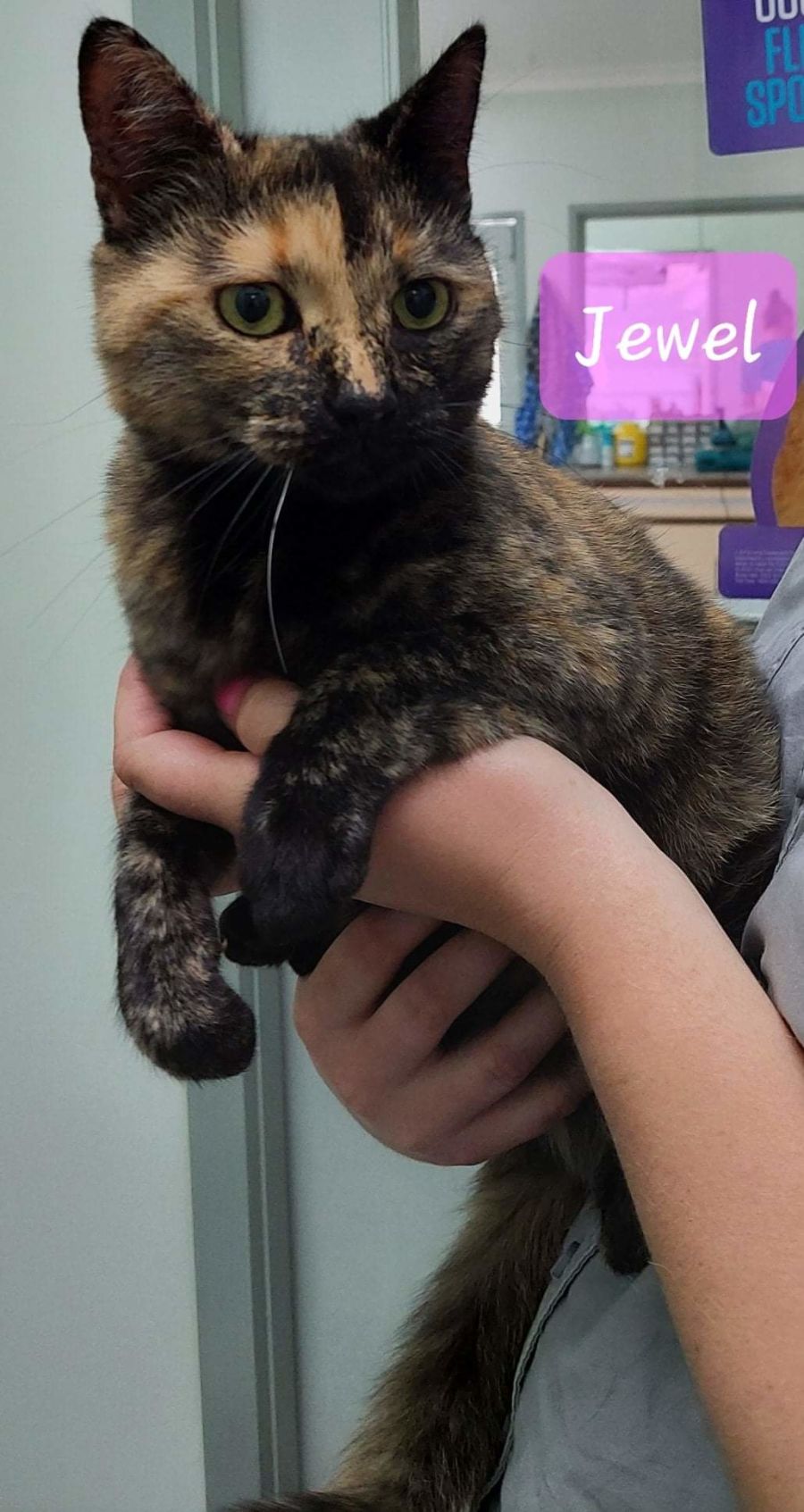 We named her Jewel and that name is very fitting for this girl. Jewel is in foster care and loving life. Sleeping on the bed and soaking up the life as a total indoor cat.