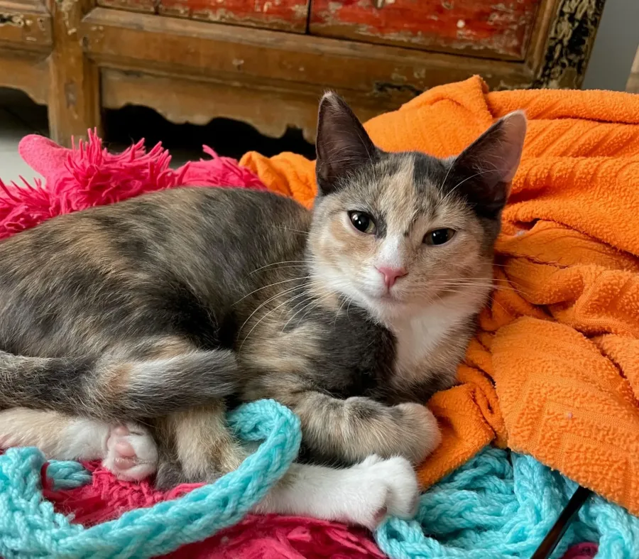 She has pretty colouring and a really loud purr. She is curious but is gentle and calm and loves warm laps and lots of cuddles. Like most babies she alternates between napping and playing – when she’s awake she’s full of beans, and loves to chase her toys, especially empty coffee pods!