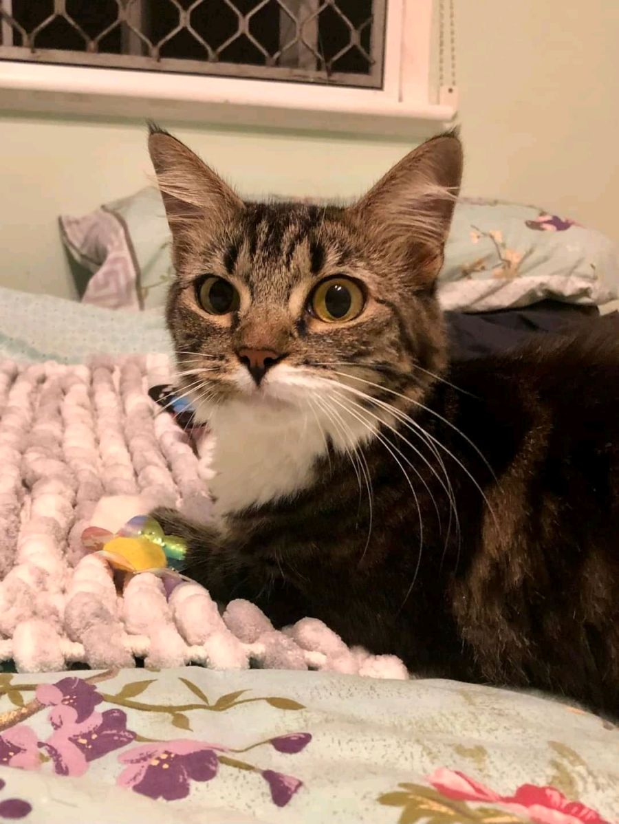 We decided it was Mittens’ time to live her best cat life, and broke her out of the pound. With her kitten-raising days behind her, she loves playing with toys and is comfortable, curious and affectionate with people.