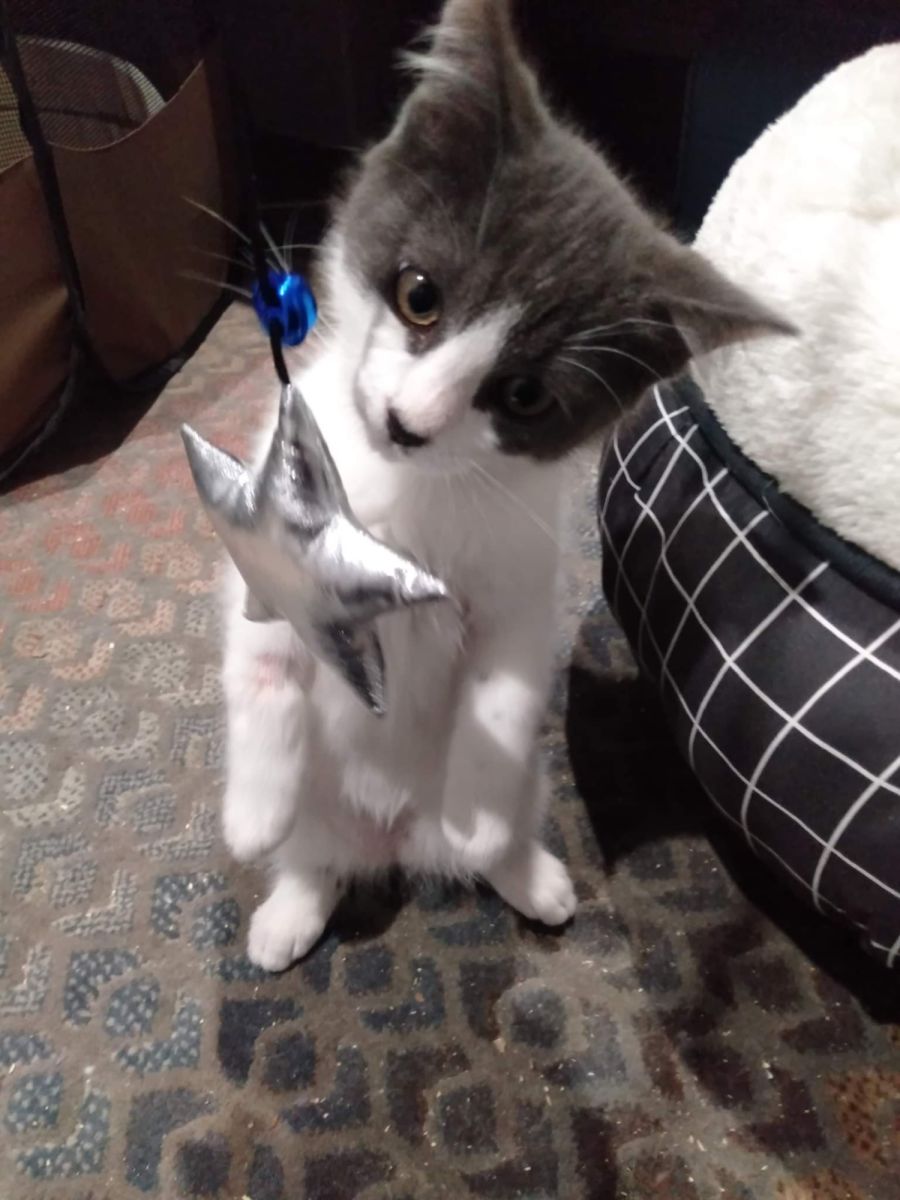 He will play with anything he can get his tiny paws on, strings, bells, balls but his favourite is definitely dangly toys.
