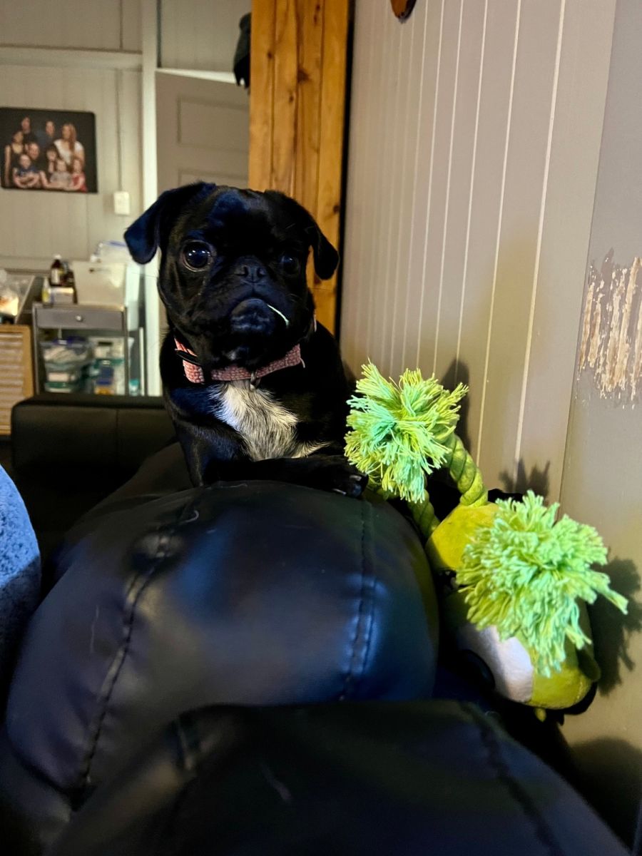 Winnie, a pug cross is 9 months old and very playful. For this reason she will be rehomed with a younger fur friend only as her antics will be too much for older doggos. Please note, she is not suited to young children.