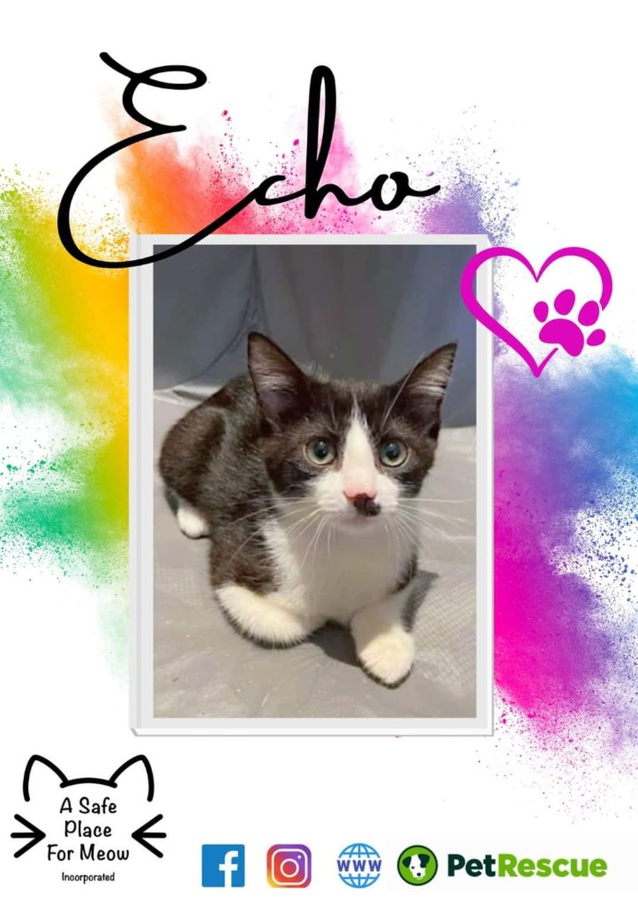 “Hi humans, I’m Echo! I love hanging out with people, I’m known for my cheerful nature and affectionate side. I love to cuddle and will purr if you want to pick me up (I love a good purr session!). I am a lover of pats and will follow you around until you give in to my charm. I’d love you to come meet me as I search for my forever home, will it be yours? I am a bit timid and require that special someone to give me time to feel safe.”