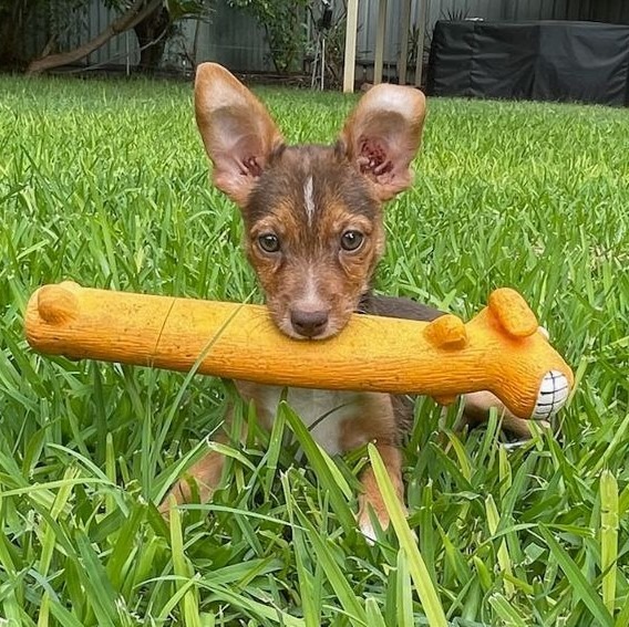 Hazel is an affectionate, intelligent, happy little girl with a magnitude of personality. As much as she loves to cuddle and nap, she also enjoys playing ""tug-of-war"" and ""fetch,"" even if the ball is three times her size! Dynamite comes in small packages with this little tyke. We believe that Hazel is a small breed and will remain at about Chihuahua size. Hazel gets along very well with other pets, her favourite treats are ""chewy chicken bites"" and she loves squeaky toys. Although Hazel has had limited exposure to children and cats, during respective interactions, Hazel has been very friendly and inquisitive. Hazel will make a wonderful family pet or a trusty one-on-one companion.