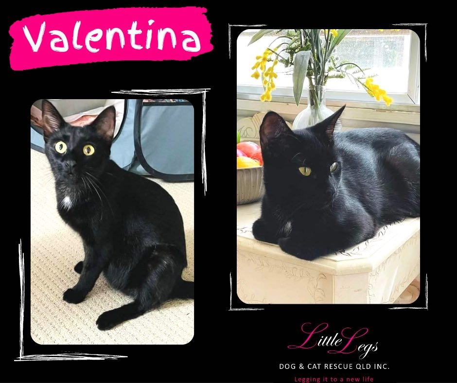 Valentina is a beautiful young cat who was rescued from the pound whilst pregnant. She has adjusted to home life easily and is a loving affectionate cat. Val likes to watch life go by from the window or the front door. Given the chance, she would love to spend her days rolling around in the sun. Valentina is a vocal cat that will let you know when she's hungry, wanting attention or wanting the curtains opened. Valentina loves to play in her tunnel and loves a daily game or tag/hide and seek. Valentina would suit a family with older kids and no other pets as she does demand attention and cuddles. Like any young cat, she is playful and will test the boundaries every now and then. Valentina is currently with a older foster dog and whilst they live together quite well, there are moments for typical cat/dog interactions. Valentina would be a fantastic addition to any home.