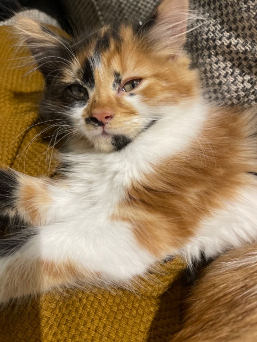 Stunning on the outside and inside..Meet Miss Calico a beautiful kitten with a calm, quiet but loving temperament is ready to find her forever home. Born in her foster carers home she has been raised amongst other adult cats, kittens, young children, small dog and large dog! She is relaxed and a snuggle bunny. When your relaxing she will come and snuggle too. She also loves to play but is the quieter one of her litter so loves to watch the going on of the house from the couch, cat tower and then jumps into play with her siblings and foster carers adult cats when she feels like it. She loves to put in your arms or when you rub behind her ear.