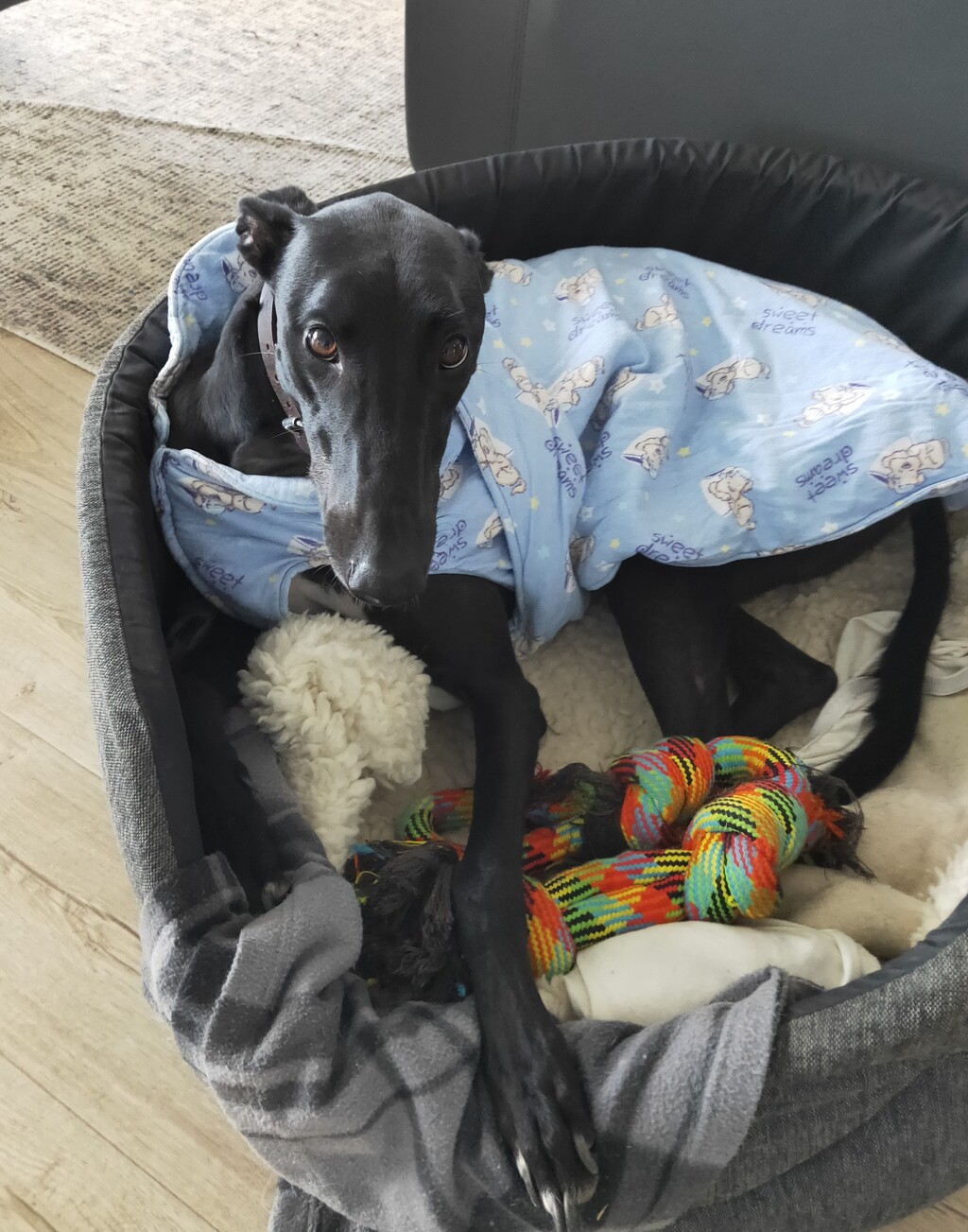 Hi my name is LENNY #2843. I am an elegant 3 year old desexed male greyhound. I am a glossy black dog with touches of white here and there. Like most greyhounds I am intelligent, gentle with a quiet disposition and despite my great athletic ability, I am very content to sleep most of the day. Greyhounds after all are built for speed not endurance requiring less exercise time than most dogs - about 20 to 40 mins a day is plenty - no marathons please! I am a very easy, clean and affectionate companion and was brought up in a family home with other pets. I am good with kids, cats and other dogs. I am not really the outdoors type, so will want to share your home and be part of your family. I would suit any kind of household, but it would be nice to have someone that's home most of the day as I like company and don't like being left alone too long. I will enjoy casual walks with you, fun drives and coffee dates, visits to friends and family, cuddles and plays in the park or beach...or even going to work with you! I'm super easy in that way. If I seem like your perfect pet match, let's meet up.