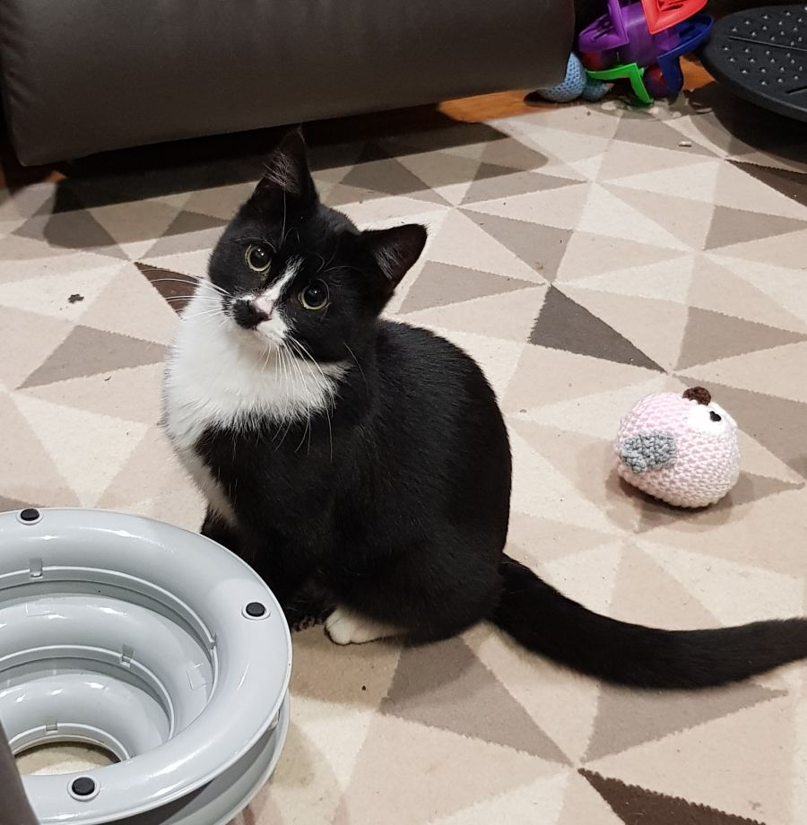 This handsome tuxedo wearing young man is so delightful. He is confident, affectionate and playful. He is a very clean cat and keeps his beautiful soft coat in perfect condition. He is not fussy with food but loves plenty of it 😂