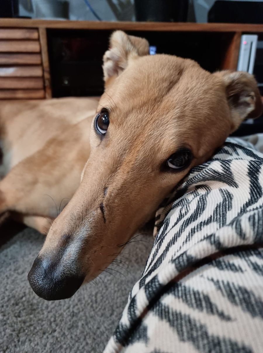 My foster family say that I’m super affectionate, and love cuddles of all sorts. I don’t like to be far away from people. I’ve stayed at home with my greyhound foster brothers but I’d prefer you are home most of the time.
