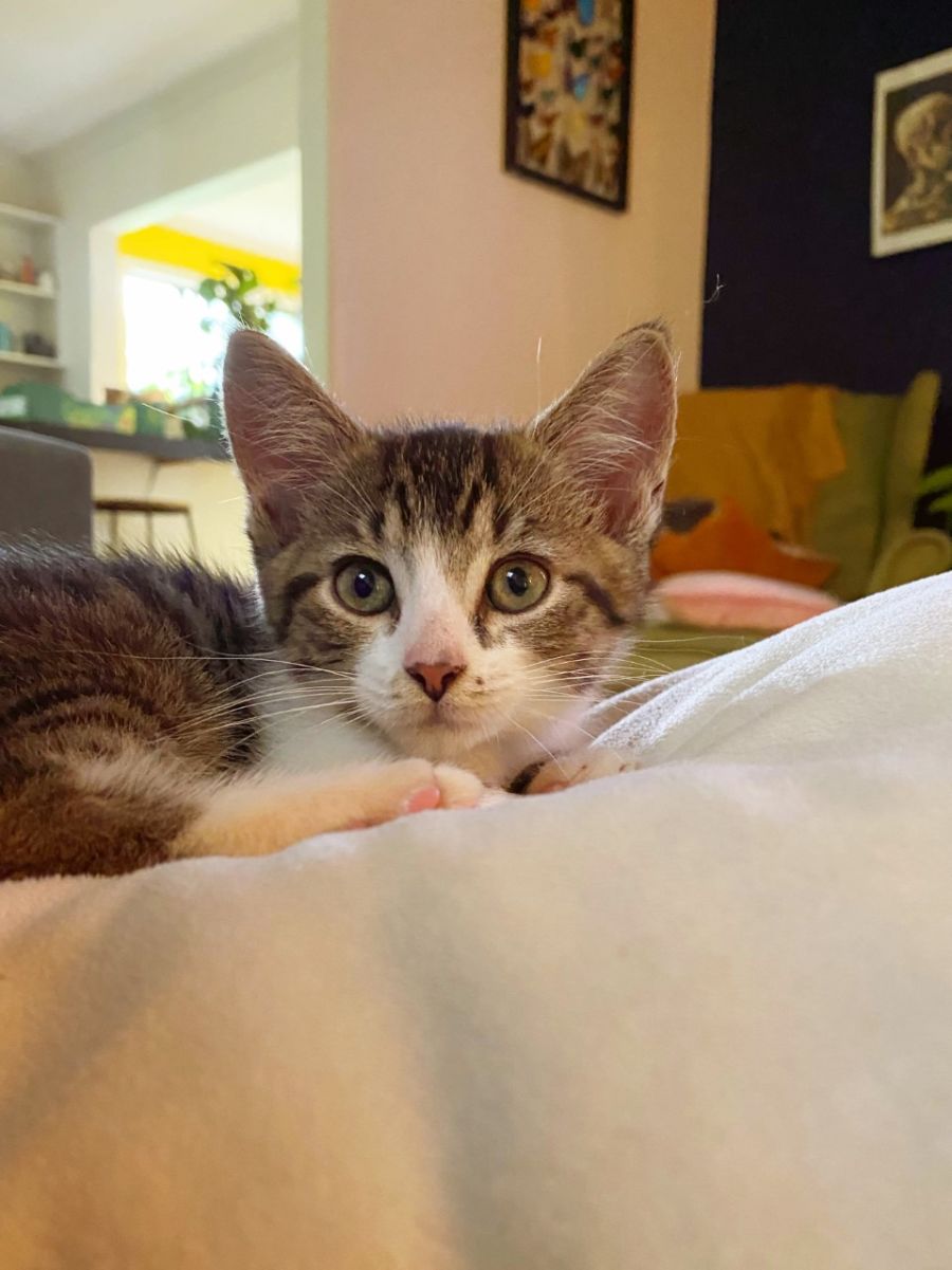 Hazel is a brown tabby with white patches. She is very playful and cuddly. Hazel is being fostered with our adult dog and cat - She has been great with them, learning manners and how to play. Hazel loves to cuddle close in the winter like a little hot water bottle.
