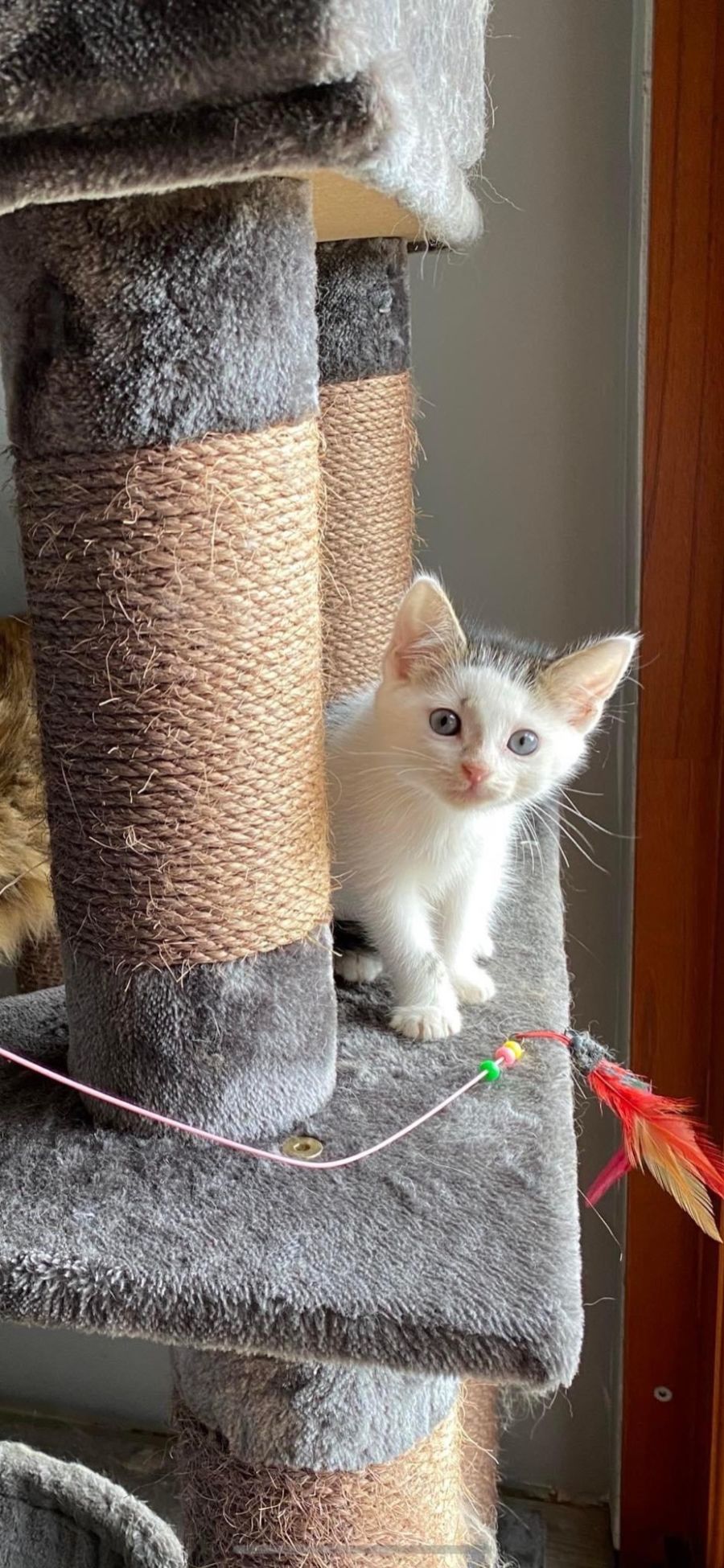He is absolutely adorable and super sweet. He loves to cuddle up anytime of the day, extremely confident and a total purr machine. He thinks he is as big as the older cats, and quite happy to push them away from the food if need be.